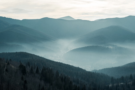 Mountain landscape with fog and clouds, Carpathians, Ukraine
