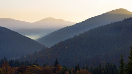 Autumn landscape in Romania. Distant mountain range and thin layer of fog on the valleys. Coniferous forest on hillsides in the Eastern Carpathians.