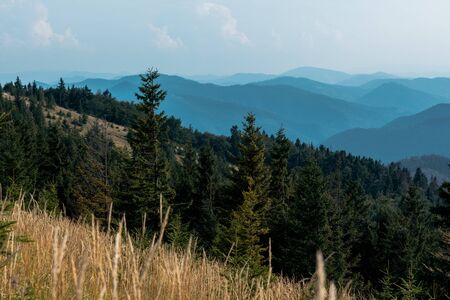 A picturesque mountain landscape. Beautiful scenery. The tops of tall pines, firs, conifers evergreen trees on a blue sky, morning fog. Ukrainian Carpathians mountain system. Meadow hills amazing view