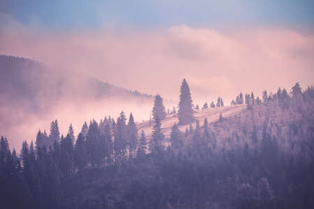 Majestic foggy forest and mountain peak. Dramatic and picturesque sunrise pink orange sky. Carpathians, Ukraine, Europe. Beauty worldmountain landscape. Exploring beauty world. Travel background.
