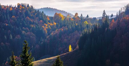 great panoramic view of romania mountain landscape. forested slopes in evening light. deciduous trees in fall foliage. warm autumn afternoon scenery. village on top of a hill in the distance