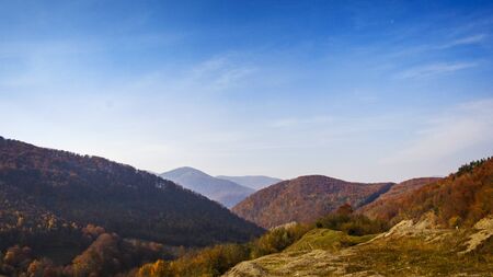 Scenic autumn landscape with mountain peaks and steep valleys in evening light under a hazy blue sky