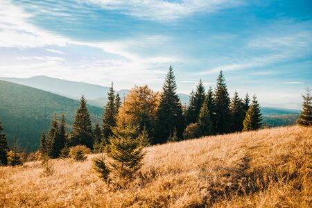Mountains hills landscape during a sunny day with blue sky clouds. Dark autumn trees. Forest in summer. Hiking in wild mountains. Adventure Local Travel Concept.