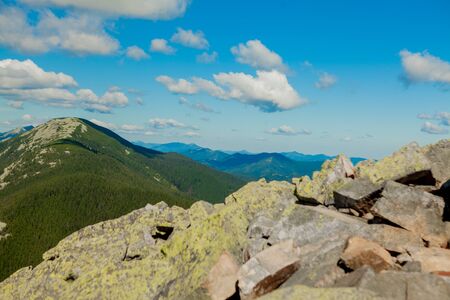 Carpathian mountains on the territory of Ukraine. Spring, Summer and Autumn in the Mountains. Mountain ranges and peaks. Sky and clouds. Ruins and rocks