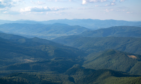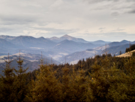 enchanting view of the forest mountains, in the distance the blue mountains of the Carpathians with blue skies