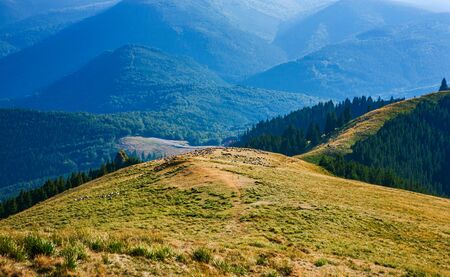 Autumn landscape in Romania. Distant mountain range and thin layer of fog on the valleys. Coniferous forest on hillsides in the Eastern Carpathians.