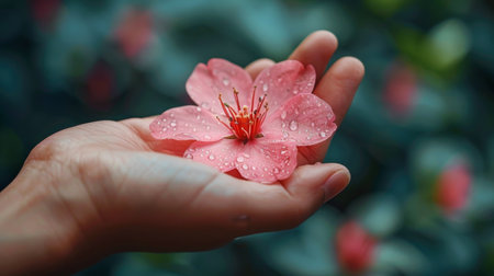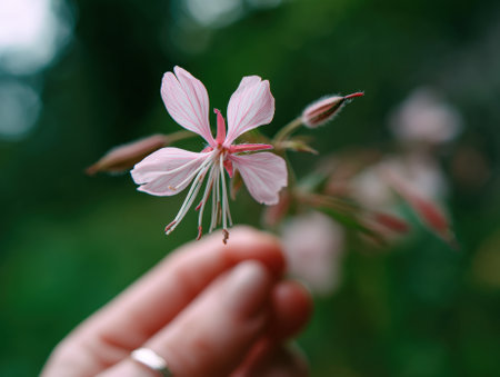 Delicate pink flower with slender petals and long stamens being gently held by a hand, surrounded by blurred green foliage, creating a soft, natural atmosphere