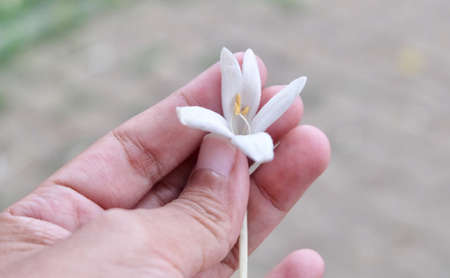 white tropical flower blooming holding on hand