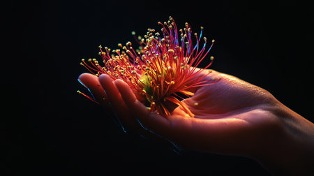A vibrant red flower with numerous thin, yellow-tipped stamens is cradled in an open human hand, illuminated by warm, colorful light.