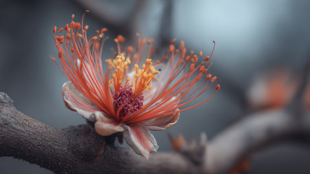 Vibrant orange flower blossoming on tree branches against soft blue background