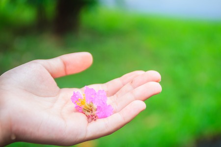 Purple flower (Lagerstroemia speciosa) on hand with green background. Lagerstroemia speciosa also known as giant crepe-myrtle, Queen's crepe-myrtle, banabá plant for Philippines, or pride of India.