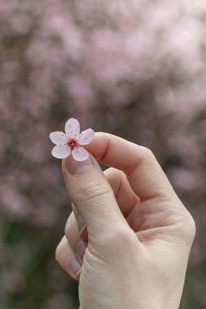 Man holding on hand cherry flowers