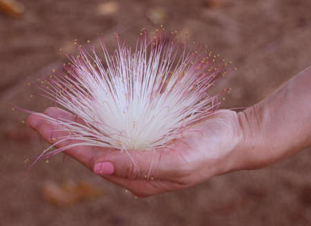 Female hand holding a barringtonia flower also known as fish poison tree, putat or sea poison tree