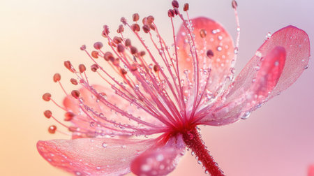 A stunning close-up of a flower with dew drops, showing intricate details and vibrant colors. Macro photography captures the beauty of nature.