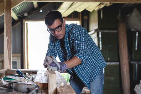 DIY woodworking and furniture making and craftsmanship and handwork concept. Carpenter working on woodworking machines in carpentry shop. Young man working as carpenter and taking wood stock.