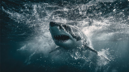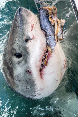 Shark with open mouth emerges out off the water on the surface and grabs bait. Attacking Great White Shark in the water of the ocean. Great White Shark, scientific name: Carcharodon carcharias.