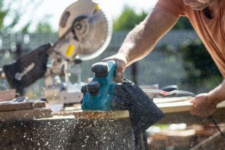 a worker treats a board with an electric plane, the photo was taken on a sunny summer day