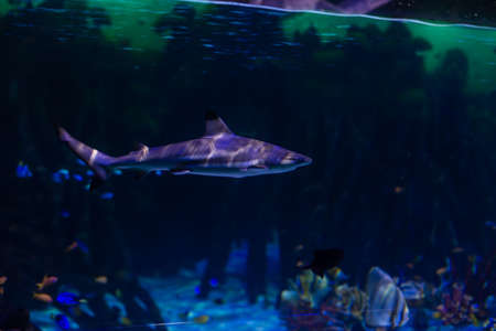 MUNICH, GERMANY - JUNE 13, 2016: Visitors looking as the blacktip reef shark (Carcharhinus melanopterus) swims at Hellabrunn Zoo in Munich, Bavaria, Germany.