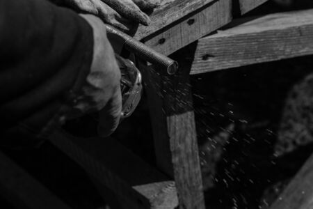 close up of Carpenter sawing a board with a hand wood saw. flying sawdust from wood. repair work