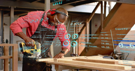 Carpenter wearing safety gear cutting wooden plank with circular saw in workshop. Industrial, craftsmanship, safety, construction, workspace