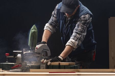 Closeup of man carpenter using electric circular saw for cutting wooden board at sawmill. Skilled professional cabinet maker works with circular saw at woodworking workshop. Lumber production factory