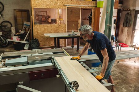 Professional Caucasian Woodworker Cutting Wooden Plank with Table Saw in His Woodworking Workshop. construction theme.