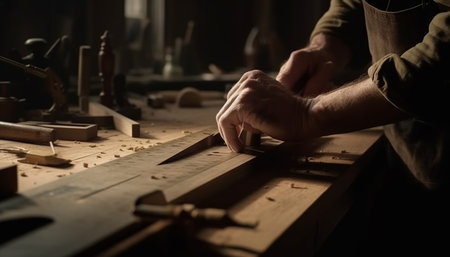 Carpenter at work, he is carving wood using a woodworking tool, hands close up, carpentry and craftsmanship concept