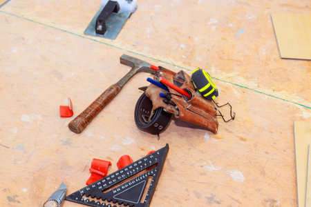 Top view of tool belt bag and old instruments constructor or renovation for build and repair house on rustic grunge wooden background