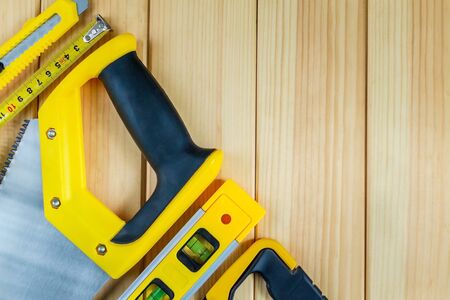 The carpenter tools on wooden bench, plane, chisel,mallet, tape measure, hammer, tongs, pliers, level, nails and saw the view from the top