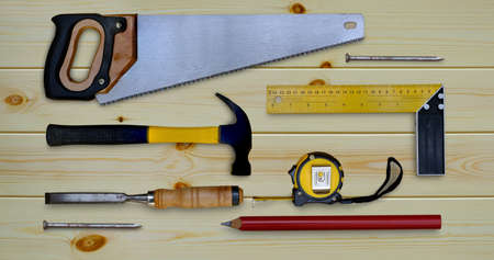 Hammer saw tape measure try square pencil and chisel collection of woodworking handtools on a workbench wooden
