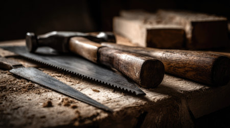 Close-up view of a hammer and saw resting on a rustic wooden workbench. The tools are positioned in a way that highlights their worn and aged features, suggesting use and craftsmanship. The wood surface shows the marks of work, with visible sawdust. The image's lighting emphasizes the texture and shadows of the tools and the wood.