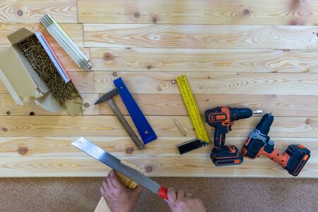 professional carpenter installs natural wooden planks on cork floor in empty unfinished room under reconstruction. Improvement, renovation and carpentry concept