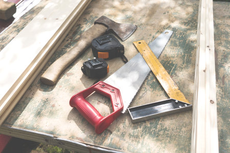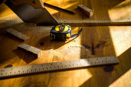 Hamer chisel Tape measure Ruler Collection of old and new woodworking handtools on a rough workbench wooden