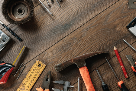 Equipment and tools in carpenter's workshop on the table. Selective focus.