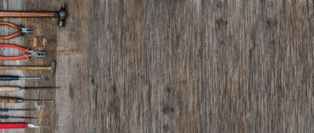 A construction tool on a brown wooden background. View from above. Picture background, screensaver. The concept of construction, repair, construction, production, design. Copy space.