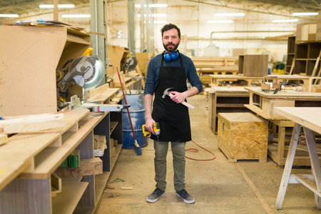 Handsome latin man standing in a woodshop holding a power drill and a hammer. Wood worker wearing an apron and hearing protection