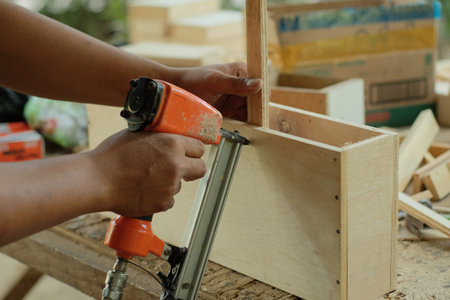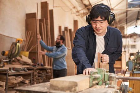 Carpenter working on wood craft at workshop to produce construction material or wooden furniture. The young Asian carpenter use professional tools for crafting. DIY maker and carpentry work concept.