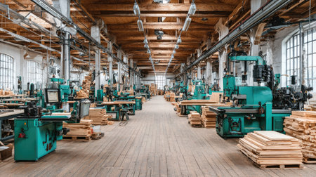 Extensive interior shot of a woodworking factory. Stacks of various types of wood, alongside rows of teal-colored woodworking machinery are arranged in an industrial interior. The wooden floor and large, high ceiling with beams are prominent features.
