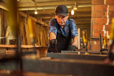 Man doing woodwork in carpentry. Carpenter work on wood plank in workshop