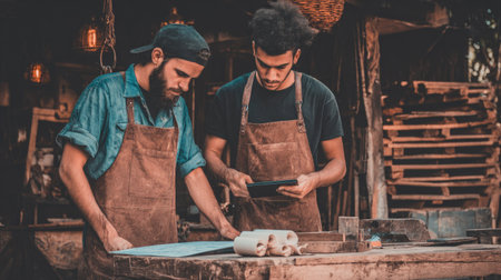 Two men in aprons, working in a wooden workshop. They are reviewing blueprints on a workbench, one man using a tablet. The background shows wooden pallets stacked neatly.