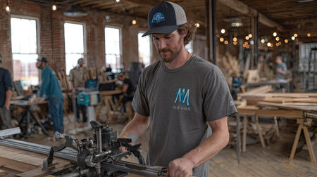 Skilled craftsman is operating a woodworking machine in a well-lit workshop. Various pieces of wood and tools are visible in the background.