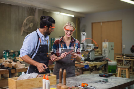 Craftsman carpenter man and woman working wood design at workplace. Carpenter wearing goggles working use sandpaper for wood polishing. factory industry woodwork. wooden small business factory.