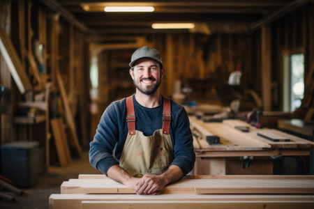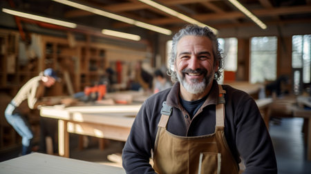 Carpenter working on wood in his carpentry workshop. He is smiling and looking at camera.