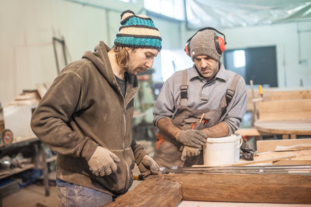 Two carpenters at the table with tools at the production . Woodworkers at the production site.