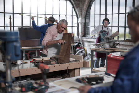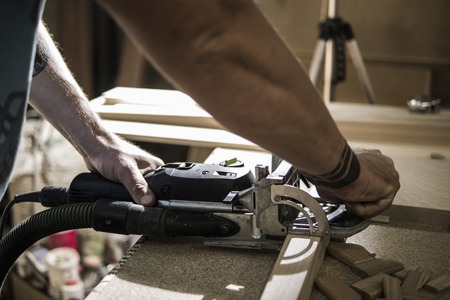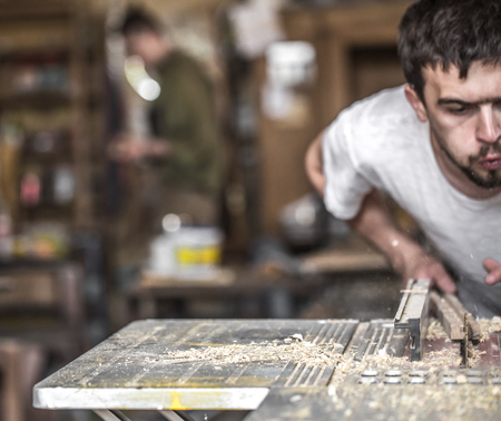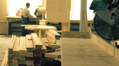 Unknown carpenters and a jigsaw in a carpentry workshop