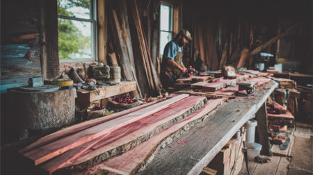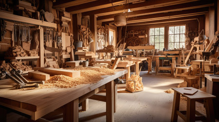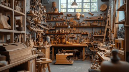 A rustic studio filled with wooden objects, tools, and materials, capturing the essence of woodworking craftsmanship.
