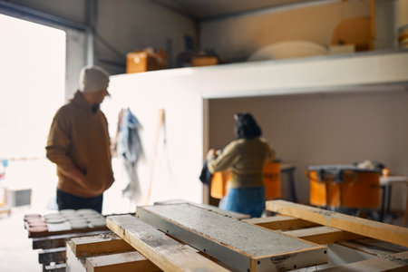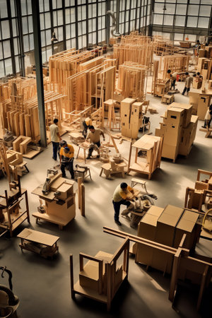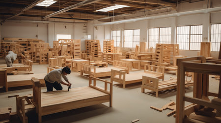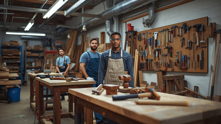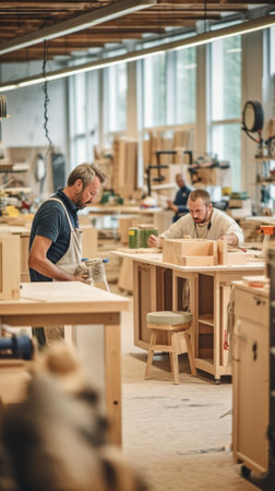 Craftsmen engage in woodworking tasks within a well-lit workshop filled with tools and materials, showcasing a productive environment.