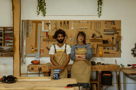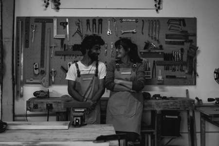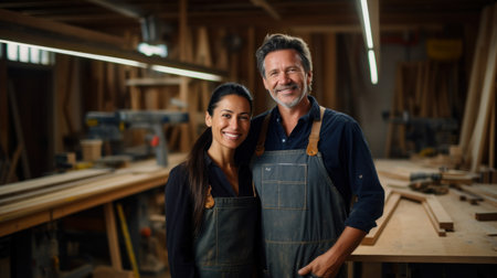 Generative AI : High angle full body of confident positive couple of carpenters craft small business owners in aprons discussing paper draft while working together in carpentry wor