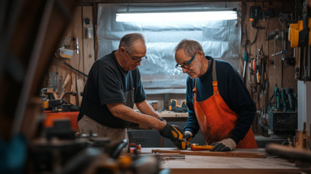 Mentor and apprentice practicing joinery at workbench in workshop, with drill press and shavings. Craftsmen, woodworking, apprenticeship, workshop, carpentry, hands-on, craftsmanship