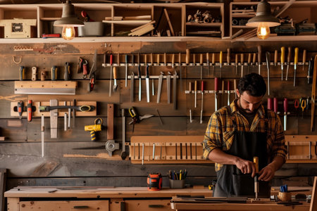 Woodworker arranging tools on a tool rack in a modern workshop. Man carpenter working with wood alone. Generative AI